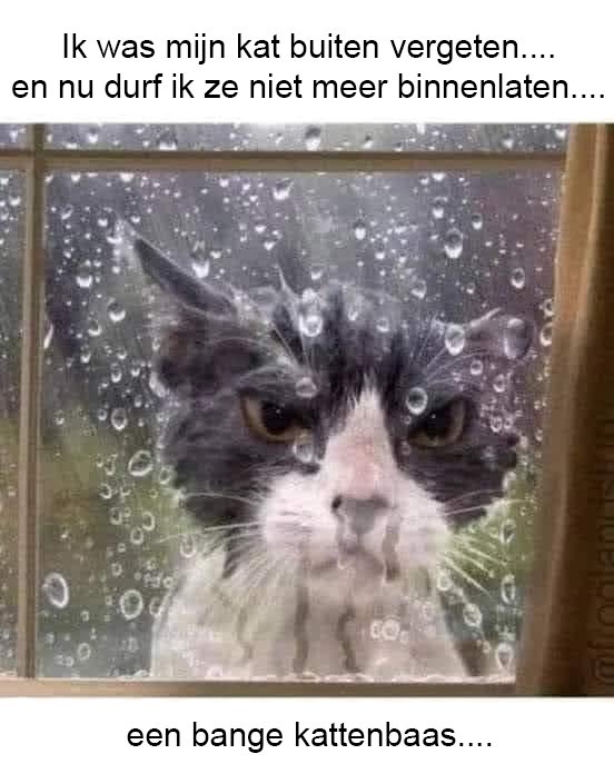 Woeste poezenogen achter een kletsnatte ruit staren me aan ... Als kattenbaas heb ik een grove fout gemaakt door haar in erbarmelijke omstandigheden te vergeten . Gaat ze me aanvallen en krabben of medelijden afdwingen als slachtoffer ? Met een klein hartje laat ik haar binnen . Met enkele poezensnoepjes verdwijnen problemen als sneeuw voor de zon !