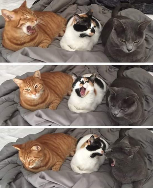 Geeuwen is een aanstekelijk verschijnsel : niet alleen bij mensen maar ook bij dieren spoort de ene de andere aan om lekker na te bootsen ... Het toont een zekere verbondenheid , want het leven is vermoeiend . Deze uitlaatklep herstelt het evenwicht en geluk borrelt weer op . Misschien zit het tussen de oren , maar een opgelucht gevoel doet wonderen !