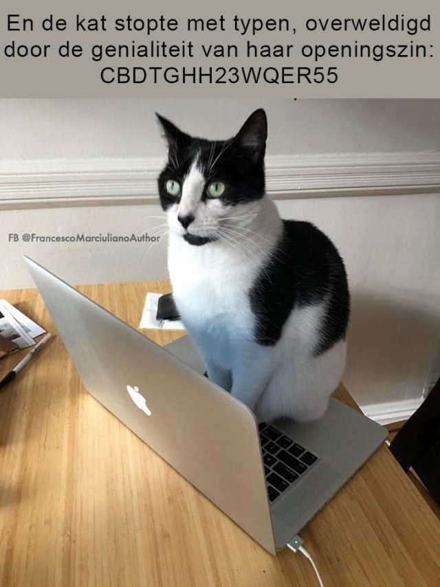De moderne kat heeft een nieuw speeltje : de laptop fascineert haar ... Terwijl mensen verslaafd geraken aan de veelzijdigheid van de internetwereld , wil ook de kat haar steentje bijdragen . Zij is overweldigd door de genialiteit van haar openingszin " CBDTGHH23WQER55 " : mijn wit-zwarte kleur zorgt voor een pittig leven !