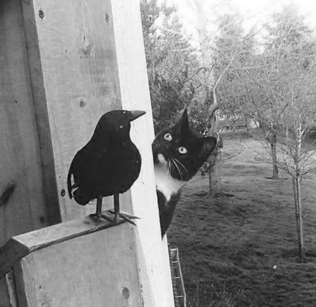 Hallo vriend , je lijkt me een rare , zwarte vogel wiens poten op een houten bakje zijn bevestigd en wiens pelsje er erg kunstmatig uitziet . Ben je een afschrikmiddel voor vogels die visitekaartjes achterlaten of voor jonge exemplaren die tegen ruiten vliegen ? Mij imponeer je niet , maar je verstoort mijn scherp observatievermogen . Laten we samenwerken : eendracht maakt macht !