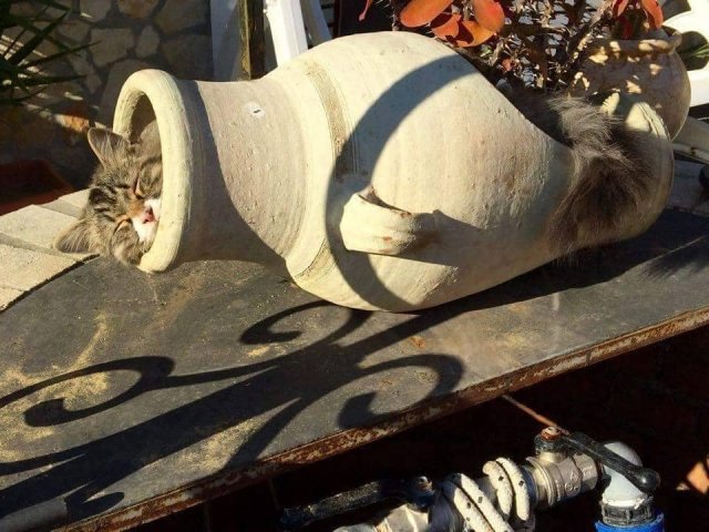 Ik geniet met volle teugen van een dutje in een kapotte , aarden kruik . Ik loop mijn fijne neus achterna en ontdek zo knusse plekjes die me opkikkeren . Beschouw deze kruik dus niet als afval , want ik lig er beschut . Wat zal mijn spitsvondige neus nog vinden om mijn comfort nog optimaal aan te vullen ?