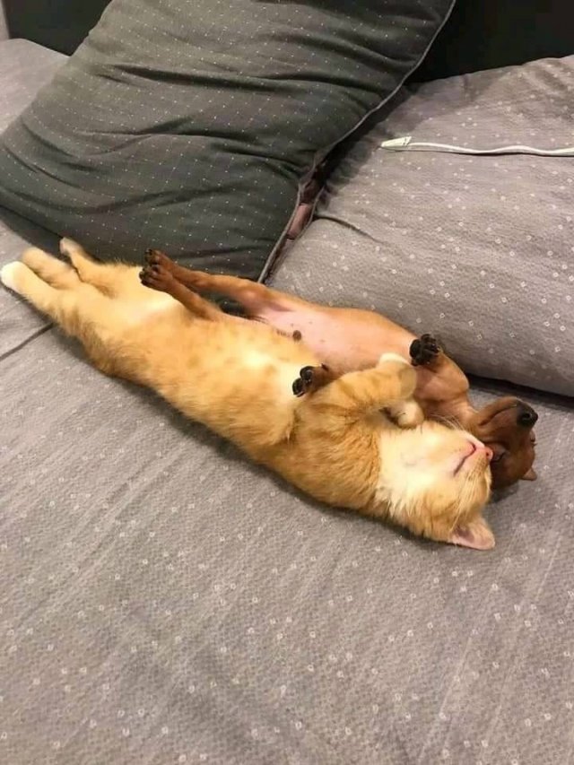 Hoe is het mogelijk dat kat en hond beiden op hun rug naast elkaar liggen met gekromde voorpootjes en gestrekte achterpootjes ? Dit voorbeeldig gedrag roept vragen op . Zouden ze extra beloond worden voor dit ideaal beeld van dikke vrienden ? Raar maar waar , er bestaan nog wonderen !