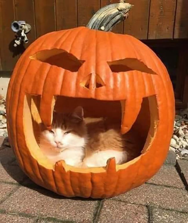 Mijn spitsvondig neusje leidt me naar onverwachte plekjes ... Terwijl deze monsterachtige pompoen bedreigend is , duik ik erin en installeer me om van het milde zonnetje te genieten . Mij houd je niet voor het lapje : dit plekje is uitstekend om angstige mensen op afstand te houden en mijn dutjestijd niet te laten storen . Noem het misschien sluw , maar gezond verstand van poesjes primeert !