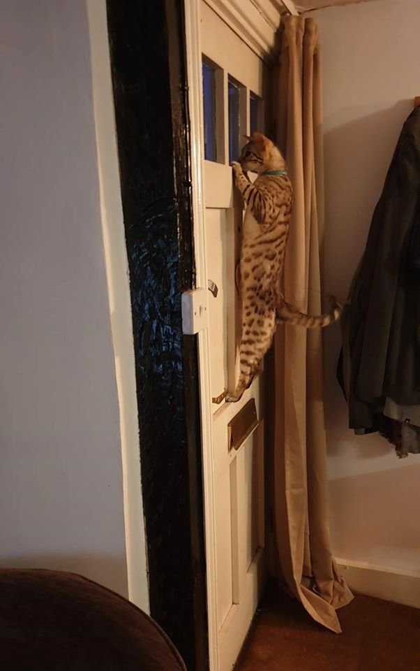 Mijn nieuwsgierigheid maakt me creatief ... Ik bestudeer de deur en merk dat die enkele steunpunten heeft . Die kunnen van pas komen om mijn klimtalent te ondersteunen , zodat ik door het raampje kan gluren . Alles kan ... Waar blijft mijn baasje , want ik rammel van de honger . Vergeet niet dat de liefde voor een dier langs de maag gaat !