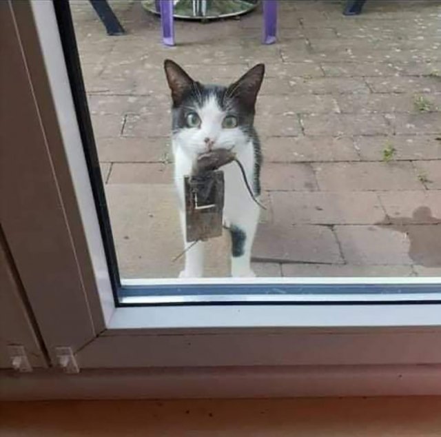 Ook in de kattenwereld heeft de jeugd technische hulpmiddelen nodig om zijn doel te bereiken ... Fier toon ik de muizenval met het zielige slachtoffer . Als de kat van huis is , dansen de muizen , maar sluwe mensen helpen henzelf en de katten . Word ik nu beloond voor mijn trofee ?