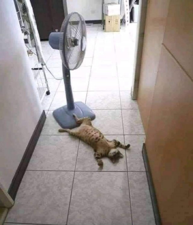 Lekker lui uitgestrekt op mijn rug op de stenen voor de snorrende ventilator om af te koelen ... Zo overleef ik de hitte . Deze houding vinden ze schattig , want ik stel me kwetsbaar op . Misschien inspireer ik hen om hetzelfde te doen : een volledige overgave aan het lot . Mijn instinct doet beroep op snikhete wijsheid : accepteer de toestand en maak er het beste van !
