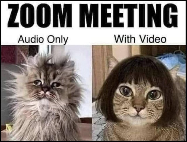 Wat zijn de voor- en nadelen van de audio en video zoom meetings ? Voor poesjes gaat de voorkeur uit naar de originele versie : lekker verfomfaaid en scheel kijkend ... Video's daarentegen toveren een volmaakt uiterlijk te voorschijn , maar het is een masker dat het ware individu verstopt . Komt er straks een derde zoommeeting dat beide voordelen versmelt ?