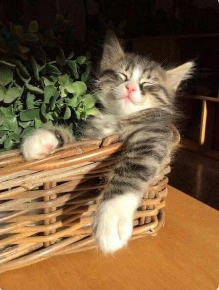Snoezepoes heeft het hoekje van de plantenmand uitgekozen om de milde zonnestralen op te vangen .Terwijl het ene pootje op de mandenrand rust , hangt het andere erover te bengelen . Ze voelt zich in haar sas met gesloten oogjes , want ze slaapt overal . Ben je ook vertederd door dit schattige tafereel ?