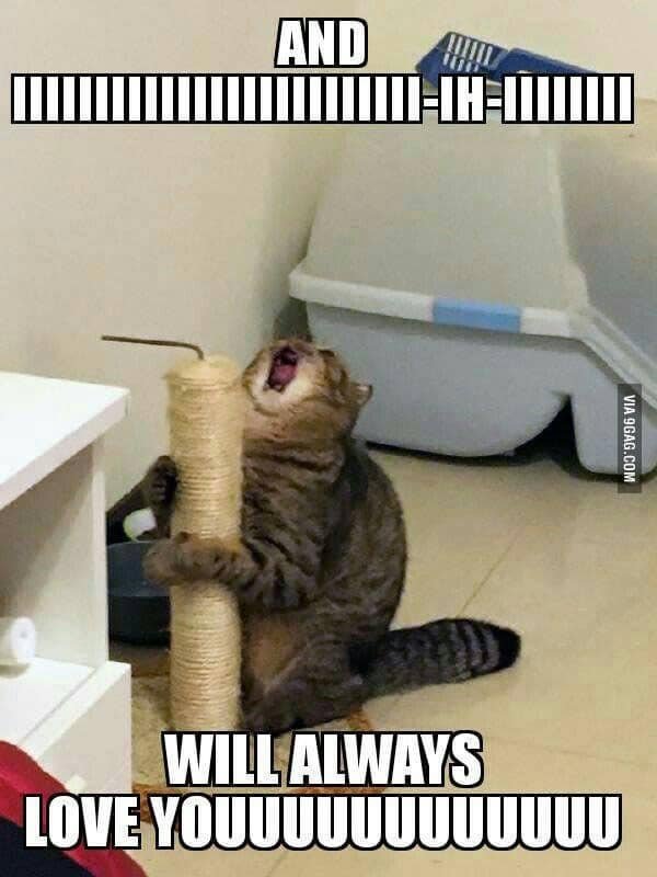 Ter ere van mijn lang verwachte geschenk , de krappaal , kweel ik een liefdesserenade : " I will always love you " . De toon is tragikomisch , zodat sommigen het als kattengejank bestempelen . Vlijtig haak ik mijn scherpe nageltjes in de met koord beklede paal en pruts stukje bij stukje de buitenste laag los . Goed begonnen , is half gewonnen !