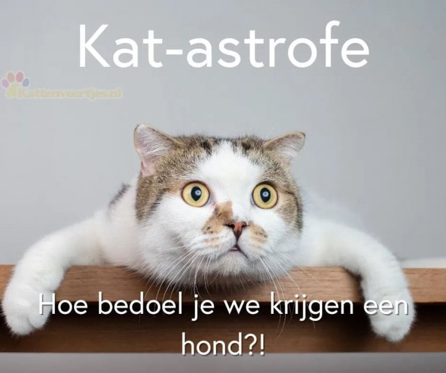 Hoe bedoel je : we krijgen een hond ! Houden jullie me voor het lapje ? Met verbijsterde ogen staar ik in de verte : mijn zelfvertrouwen is gedaald onder nul ... Mijn charmante eigenschappen worden genegeerd en vervangen door rusteloos geblaf om in het middelpunt van de belangstelling te staan . Deze " Kat - astrofe " zal nog een staartje hebben : houd je hart maar vast !