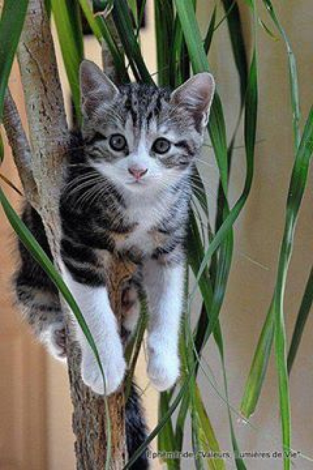 Ik hang op een tak tussen groene bladeren ... Woef heeft me verplicht om me hier schuil te houden terwijl hij rustig wil eten zonder pottenkijkers !