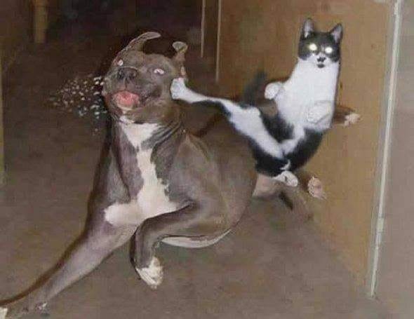 Het is donker , maar dat schrikt poesjes niet af : de oogpupillen passen zich aan . Woef dommelt rustig in bij de uitgang van het terras . Plots bonkt mijn achterpoot driemaal tegen zijn kop ... Woef is zo verrast dat hij spontaan een gulp speeksel de lucht in stuurt . Pak aan : mijn avondwandelingetje storen is schandalig . Wie niet horen wil , moet voelen !
