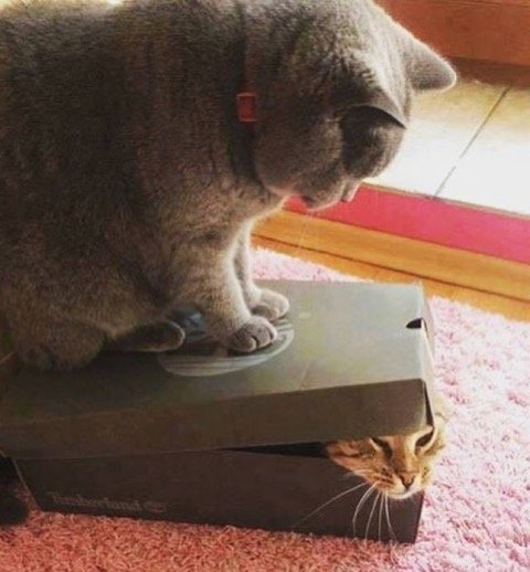 " Wat beloof je nu ? " kraamt pestkop Minoe uit ... Mijn kopje wordt geplet door het deksel van de schoendoos en belet me eruit te komen . Een kartonnen doos is nu eenmaal een begerenswaardige schat in de poezenwereld . Dwingt hij me deze plek te lenen ? Ik voel me beledigd , maar geef toe . Misschien komt er weldra wel een nieuwe doos die ik dan meteen zal inpalmen !