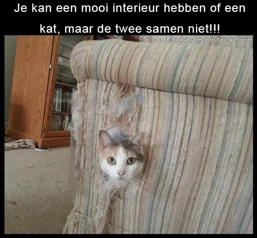 Wat zijn dat voor toeren ? Een snoezig poezenkopje dat door de leuning van een zetel opduikt naast pluisjes die het resultaat zijn van zijn deskundig werk ... Ieder poesje verlangt naar een poesvriendelijke plek en sommigen interpreteren dit op een originele wijze . Wat is het fijn om de inhoud ervan te bestuderen !