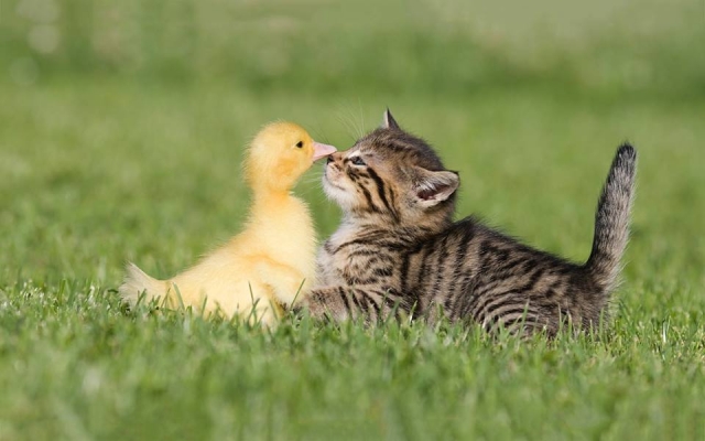 Wie ben jij , vraagt het poesje . Zo'n geel beestje heb ik nog nooit gezien . Wil je met me spelen en je bek op mijn neusje leggen ? Zo worden we dikke vrienden !