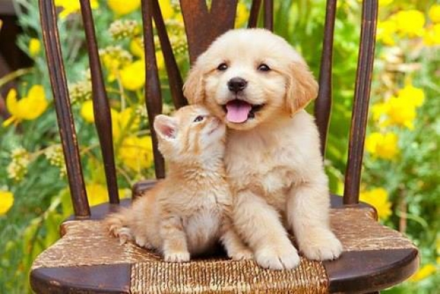 Ik hou van deze Woef : samen delen we dezelfde stoel . Ook onze pels komt overeen : we vormen een lief duo ... Ik neus onder zijn kin : dat kriebelt een beetje en dat vindt hij fijn !