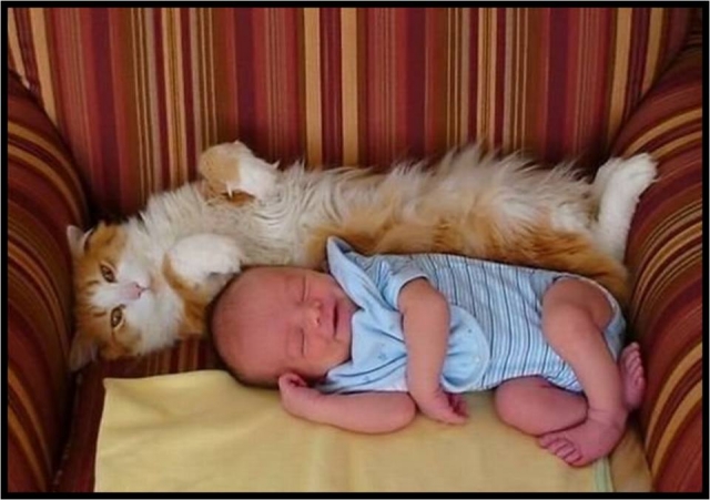 De baby voelt zich zalig met mij tegen zijn rug . Mijn pels is zacht en warm . Ik hou mijn voorpootjes gebogen , want ik wil hem niet storen . Ben ik geen goede babysit ?