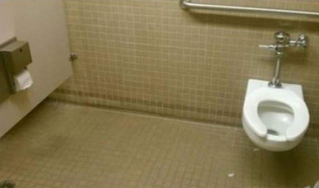 de mannen staan aan de rol, kuisen het van de grond op en gaan dan het papier in de wc gooien