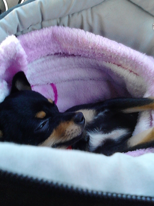 Lady ligt in haar draagzak in de auto te slapen