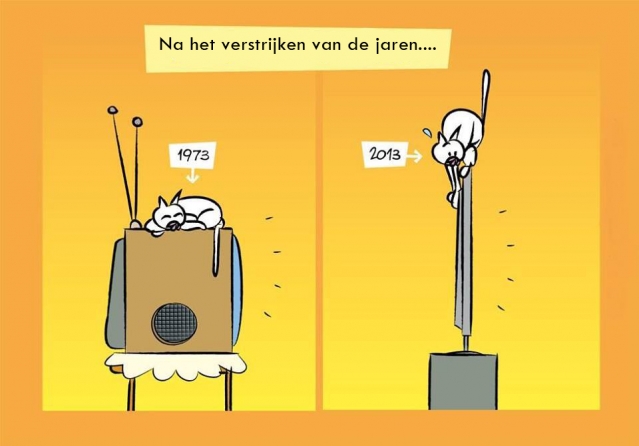 De vernieuwde techniek maakt het poezen niet gemakkelijker als ze boven op het T.V. - scherm willen liggen ... Hun comfortabel plekje is verdwenen , zodat ze nu verplicht zijn voor het scherm plaats te nemen , want erbovenop is onmogelijk geworden !