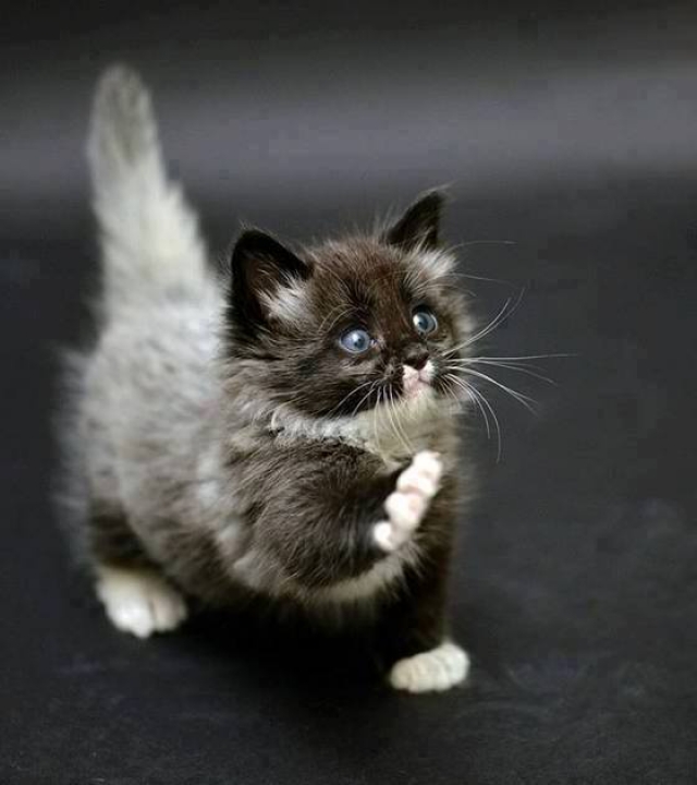 Ben je me vergeten ? Ik wil ook een stukje vlees ! Met mijn mollige poot kom ik het halen . Mijn blauwe oogjes schitteren al en mijn staart staat rechtop : laat er geen gras over groeien ...