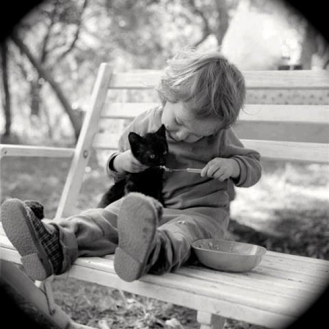 Ik heb een kommetje met lekkere stukjes kip en voeder mijn kleine vriend . Hij moet nog flink groeien en sterk worden zoals ik . Als dessertje een kommetje verse melk . Gezonde voeding doet vaak wonderen !