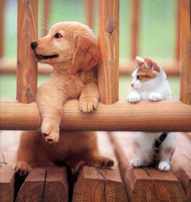 Tussen de achterpootjes van de poes komt een gestreept staartje naar boven ... Dit lijkt niet het hare ! Zit ze op een ander beestje ? Zowel Woef als zij kijken naar links en oordelen dat het niet geschikt is voor zo'n jong ding !