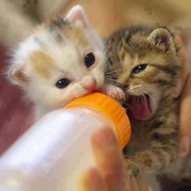 Wie mag eerst aan de papfles zuigen ? Opgelet , want met die scherpe klauwtjes maken jullie de rubberen zuigtepel stuk ! Ieder krijgt zijn deel : vechten is uit den boze !