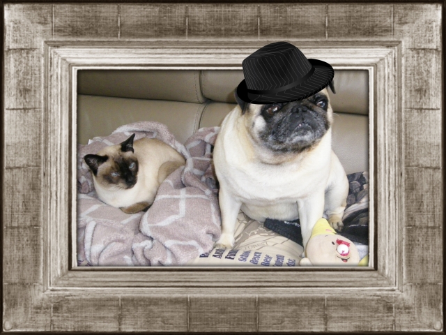 Is dit geen uniek schilderij ? Mopske met de hoed op is een echte heer , maar de siamees ligt op een comfortabel dekentje . Zij laat zich niet ringeloren , want vrijheid is voor haar heilig !