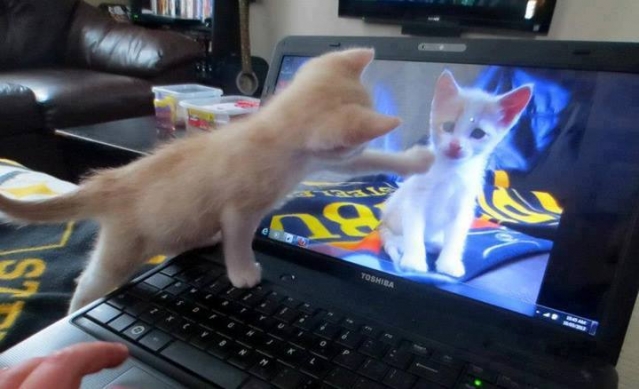 Waarom reageert dit poesje niet op mijn uitnodiging ? Dat begrijp ik niet ... Ik ben toch lief en schattig . Zal ik even achter het scherm kijken ? Tevergeefs ... Ik hou niet van computers : het zijn bedriegers !