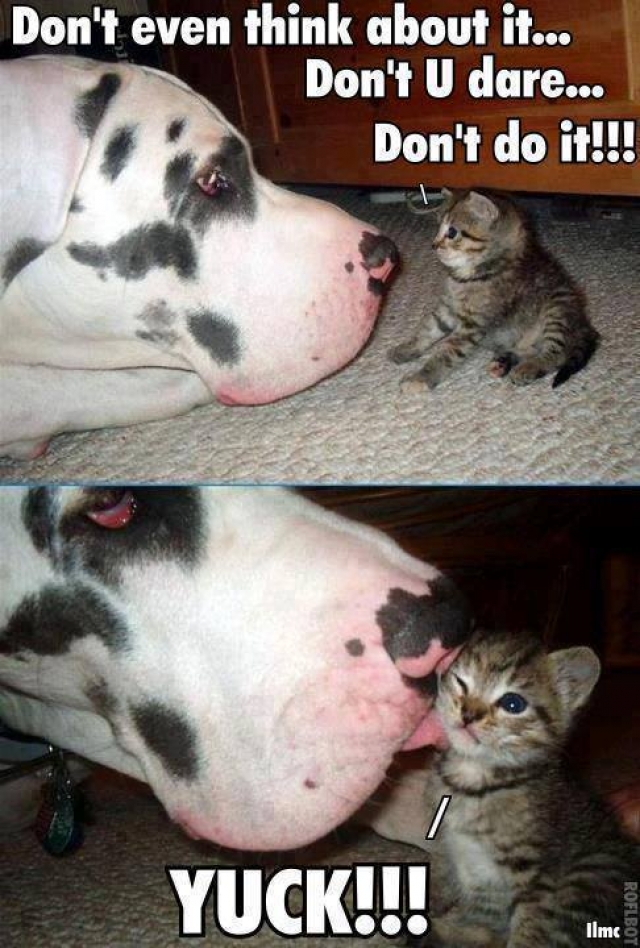 Al mijn smeken is tevergeefs geweest : Woef heeft me toch gelikt ... Ik was bang voor zijn enorme kop , maar mijn nieuwsgierigheid dreef me er toch naartoe . Nu durf ik meer in zijn omgeving komen zonder schrik te hebben !