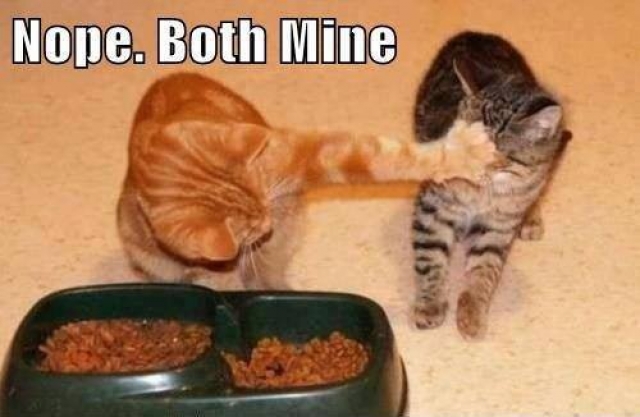 Omdat ik de oudste ben , heb ik het recht om als eerste van de beide etensbakjes te proeven . Daarna kom jij aan de beurt ... als er nog iets over is !