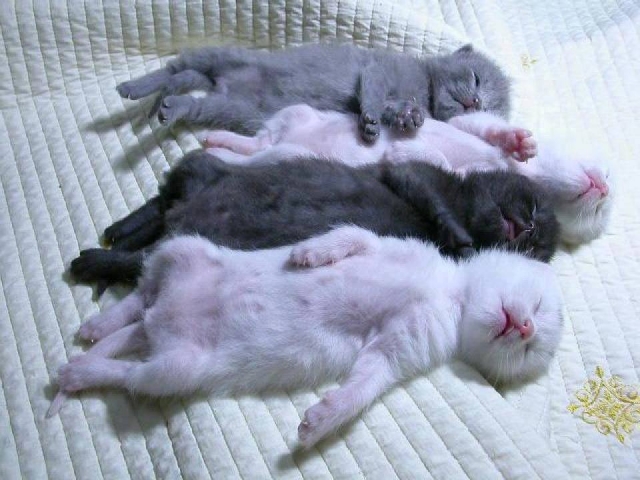 Zalig ... vier poesjes : twee witte en twee grijze genieten van platte rust . Zouden wij , als mensen , daar geen voorbeeld aan nemen ?