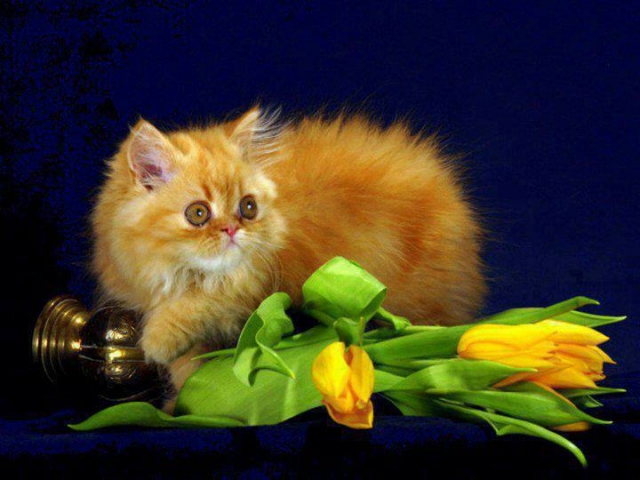 Voor mijn baasje heb ik deze gele tulpen uit hun vaas bevrijd ... Zal zij me dankbaar zijn of zal ze zich eerder teleurgesteld voelen ? Met een poesje als ik weet je maar nooit !