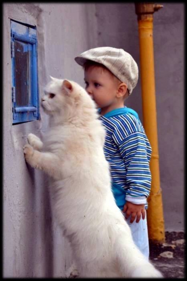 Als mijn poes op haar achterste poten staat, zijn we even groot en kunnen beiden door het raampje zien . Zij staat vooraan , want ze heeft betere ogen en een scherper gehoor . Een nest jonge vogeltjes ... Hier blijven poes !