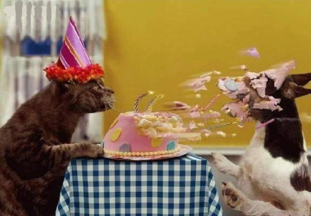 Vier jaar : dat wordt gevierd met een lekkere taart met kaarsjes ... Onze poes blaast zo onstuimig dat een deel in de snuit van Woef terecht komt . " Dank je , "zegt Woef ," dat ik als eerste mag proeven , feestvarken ! "