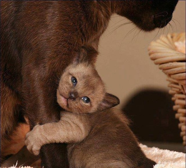 Ik grijp mamies poot vast , want ik wil niet dat ze me alleen laat . Ik voel me bedreigd door Woef , want die komt dan aan mij snuffelen . Zo'n groot , vreemd beest is gevaarlijk ... Mamie sleept me naar de mand en samen sluiten we er onze oogjes op weg naar vreedzame plekjes !