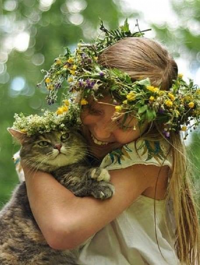 Omdat mijn baasje een wilde bloemenkrans draagt , krijg ik er ook eentje op mijn kop ... Ik voel me daar onwennig bij . Ze vindt het snoezig . Geef mij liever een snoepje om mee feest te vieren !