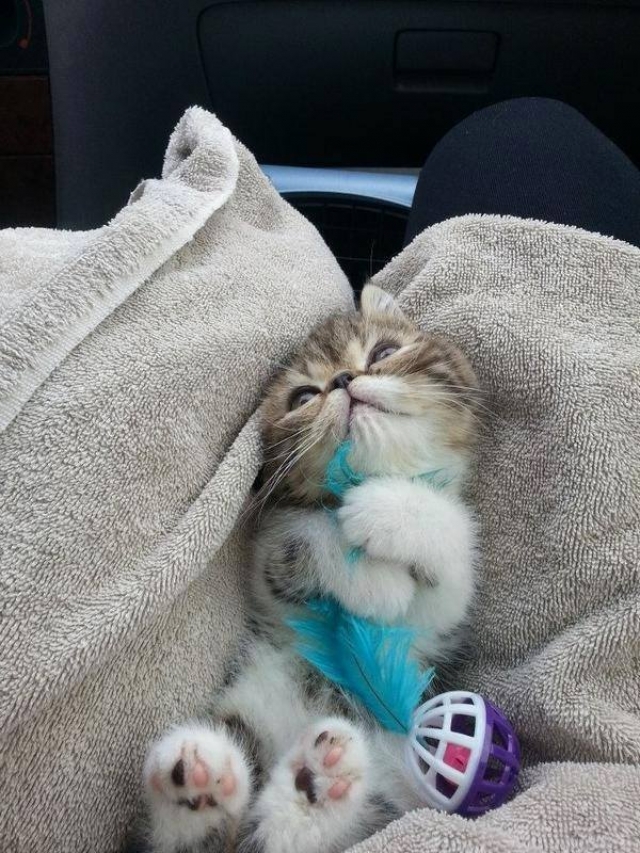 Ik mag mee naar de veearts voor een spuitje en lig comfortabel op een zachte handdoek in de auto . Om me te troosten heb ik een pluimpje en een rammelaar bij . Doet een prikje pijn ?