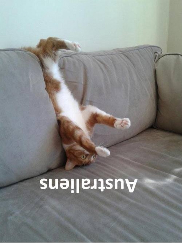 Is een Australische poes een tegenvoeter voor ons ? Als je de wereldbol bekijkt , is dat zo . Ze ziet haar omgeving liever omgekeerd : ieder zijn smaak dus !