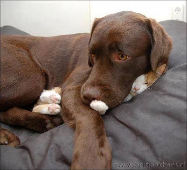 Nu overdrijft Woef weer:ik ben bijna verpletterd ... Gelukkig kan mijn voorpoot zijn neus raken en met mijn achterpootjes kan ik zijn voorpoot wegduwen . Een klaaglijke miauw helpt misschien ook . Beseft hij zijn stommiteit of is actie nodig ?