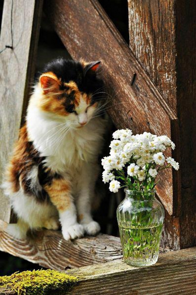 Zijn dat bloempjes voor mijn verjaardag en ruiken ze lekker ? Voorzichtig uittesten ... Het valt mee . Zouden ze ook muisjes lokken ? Dan is mijn dag pas geslaagd !