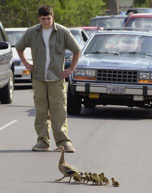 Dit heb ik zelf ook eens meegemaakt. De autobestuurder achter mij snapte er niks van tot hij de eendenfamilie zag verschijnen. Toen kwam er een big smile op zijn gezichtç