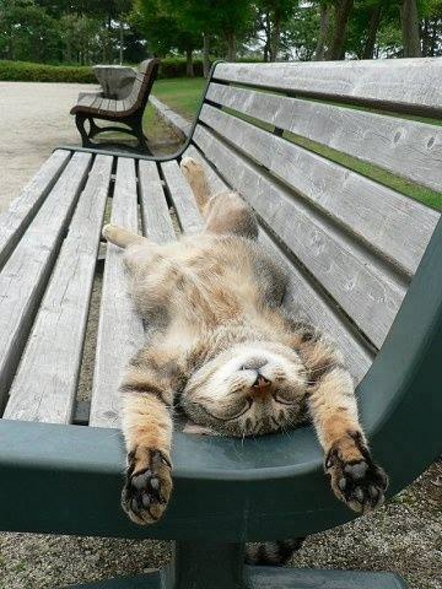 Waarvoor dienen openbare banken ? Om luie poesjes te laten uitrusten ? Op deze rustige plek is er geen bezwaar tegen . Zij benut het juiste tijdstip en de juiste plaats om te genieten met volle teugen !