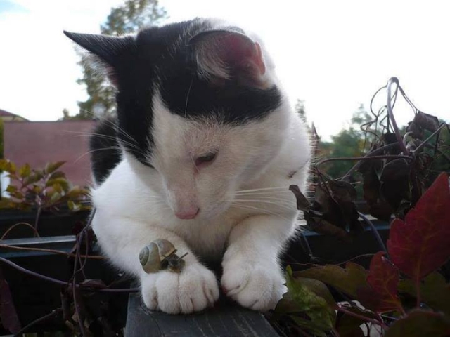 Wat voel ik op mijn pootje ? Dat gekriebel komt uit een huisje en laat een spoor na ... Het heeft voelsprieten en lijkt kleverig . Zal ik het opeten of wegjagen ?