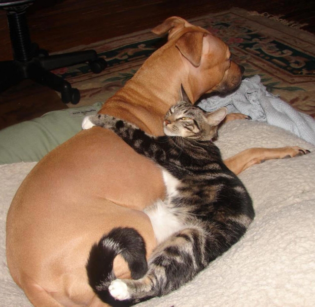 Als ik er in slaag om een poot over zijn rug te leggen , is Woef tevreden , want dan voelt hij mijn nabijheid als een vriendendienst ... Hij valt dus voor poezelijke charmes !