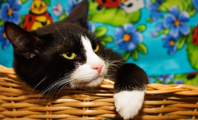 Deze rieten mand is mijn territorium in huis . Met op de achtergrond lieveheersbeestjes en bloempjes voel ik me in mijn nopjes . Ik heb geluk : een echte pasja-poes !