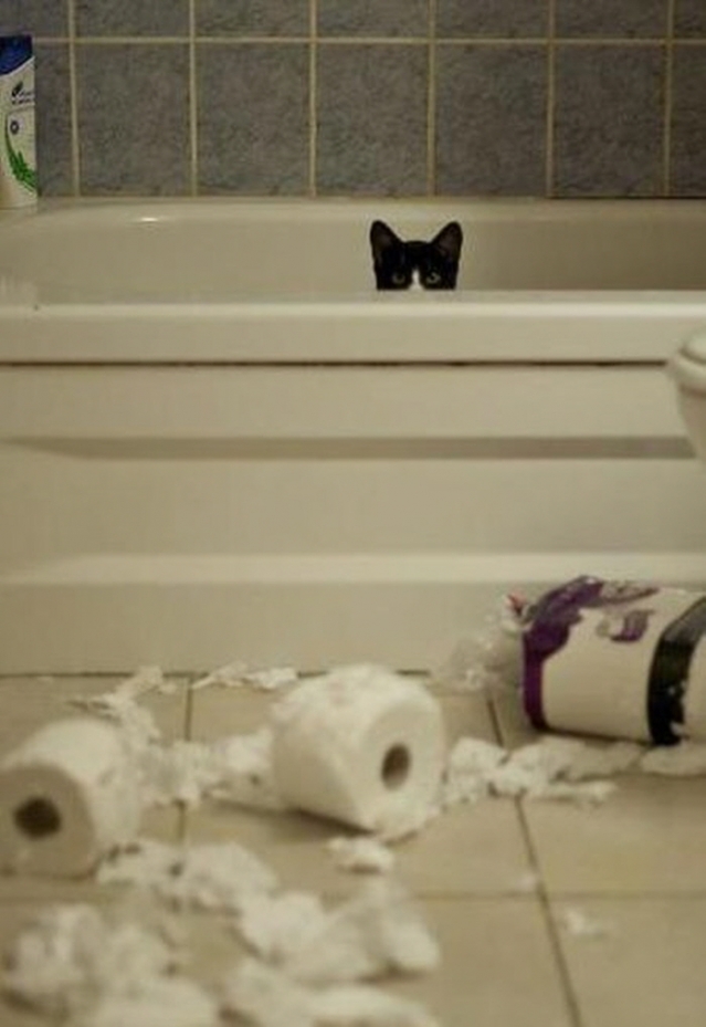 Ik heb mij verstopt in het grote ligbad ... Omdat ik opgesloten zat in de badkamer , werd ik een beetje zenuwachtig en heb ik W.C. blaadjes verscheurd . Ik heb er een chaotisch kunstwerk van gemaakt . Knap toch ?