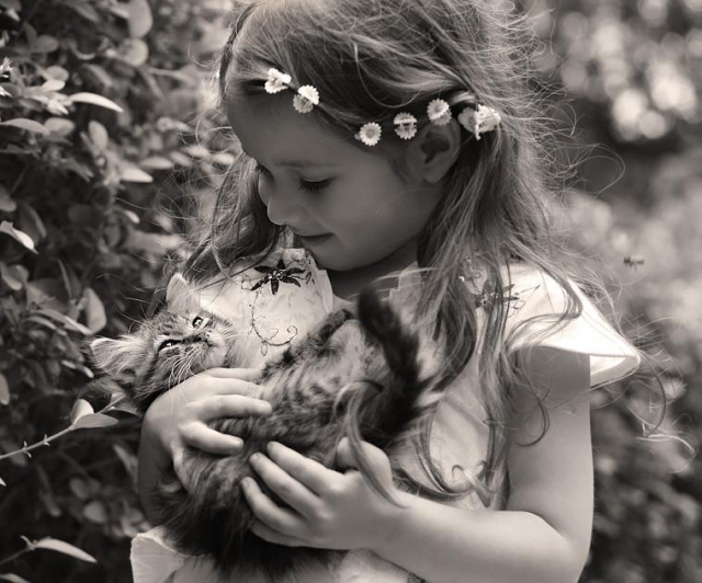 Met een glimlach kijkt dit kleine meisje vertederend naar een snoezig poesje ... Wat een hartverwarmend beeld ! Was het leven maar altijd zo liefdevol ...
