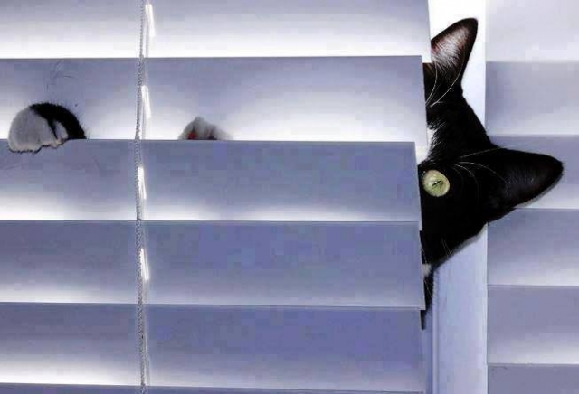 Die luxaflex belemmert mijn zicht en daarom kruip ik erachter , maar met mijn pootjes kan ik hem beschadigen en dan is het baasje boos !